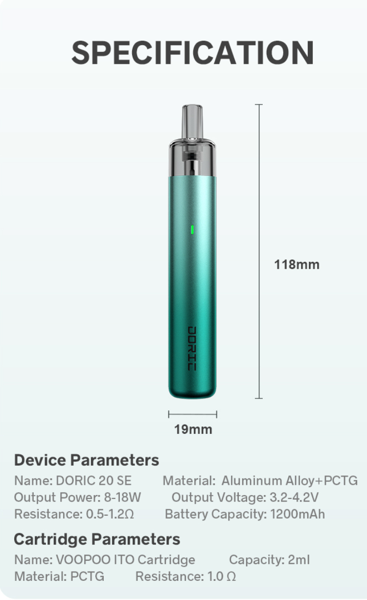 如果您喜歡時尚簡約的設計,Voopoo Doric 20 SE 絕對是您的最佳選擇!這款設備擁有 19mm 寬的超薄鋁合金機身,內建 1200mAh 電池,與 Voopoo ITO 平台的霧化芯完美搭配,帶來卓越的口感。穩定的功率輸出技術,讓您隨心所欲地享受一致的風味!